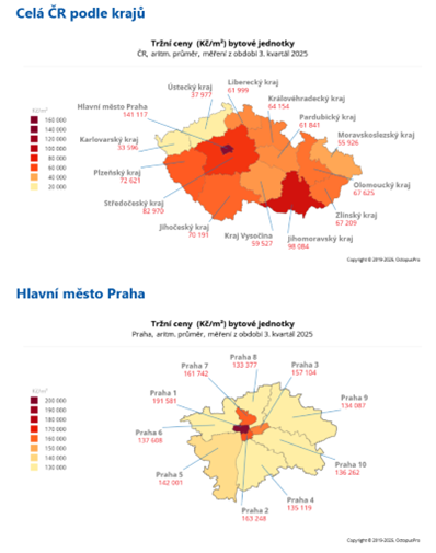 Ceny bytů v Česku vzrostly meziročně v průměru o 15 %. Ve 3. čtvrtletí dosáhla průměrná prodejní cena bytů v Praze 141 000 Kč/m², v Brně 117 000 Kč/m², zatímco v Karlovarském kraji pouze 33 000 Kč/m². Kromě růstu cen se zvýšil i počet uskutečněných transakcí a zkrátila se doba prodeje – v průměru se byt v síti Re/Max prodá do dvou měsíců od zveřejnění nabídky.