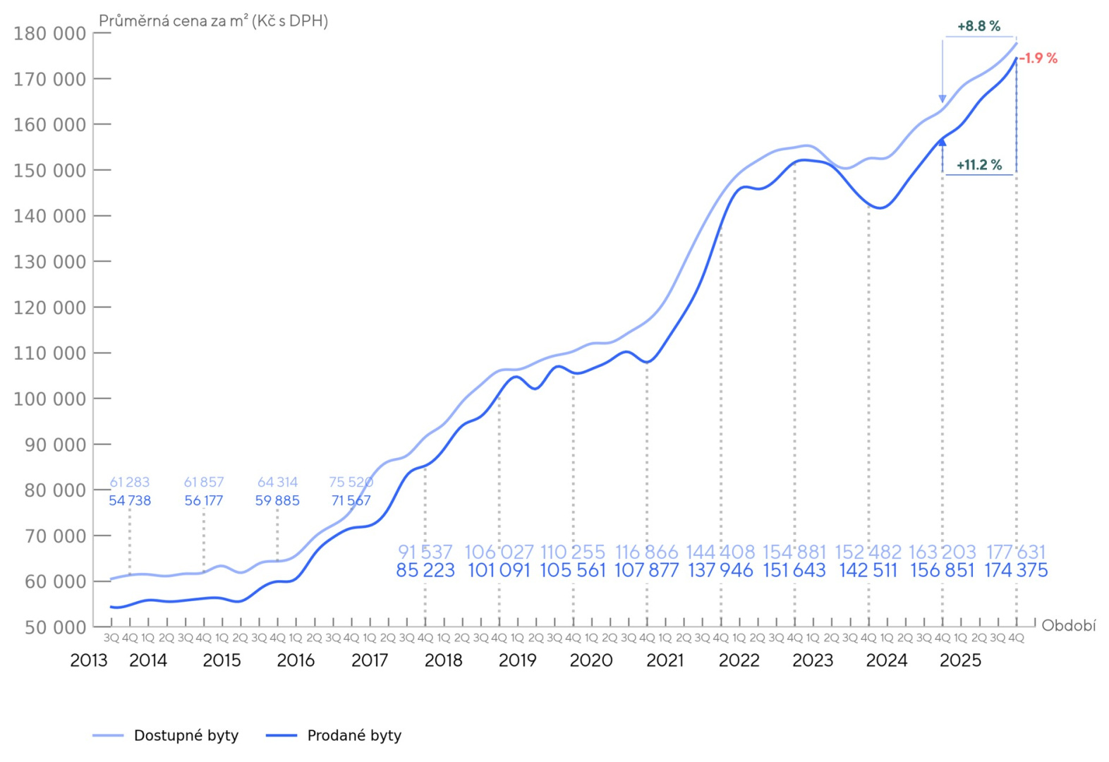 Během 4. čtvrtletí loňského roku pokračoval růst cen nových bytů, které překonaly maxima. Průměrná nabídková cena dosáhla 177 631 Kč za m², a to představuje meziroční růst o 9 %. Prodejní ceny vzrostly na 174 375 Kč za m², meziročně o 11 %. Rostou zejména náklady na stavební práce, především kvůli nedostatku kvalifikovaných pracovníků, ale také ceny stavebních materiálů a výrazněji zdražily i stavební pozemky. Zvyšují se rovněž další související služby a na vysokých úrovních zůstávají ceny energií. Nejpodstatnějším faktorem ale zůstává dlouhodobá nerovnováha mezi velmi silnou poptávkou a nedostačující nabídkou. Tu nadále brzdí nefunkční povolování nových staveb a zpožděná digitalizace povolovacích procesů.
