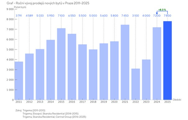 Poptávku podpořily snižování úrokových sazeb hypoték k současné úrovni okolo 4,5 %, nejistý vývoj na akciových trzích, který vedl domácnosti i investory k přesunu finančních prostředků do nových bytů, zlepšování ekonomické situace, i tlak způsobený pokračujícím růstem cen nových bytů a klesající nabídkou. Roli sehrála rovněž odložená poptávka z let 2022 – 2023, kdy část kupujících vyčkávala s nákupem na příznivější podmínky. Z hlediska dispozic zůstávají nejžádanější byty 2+kk s více než 40 % prodejů, a garsoniéry s téměř 30 %.
