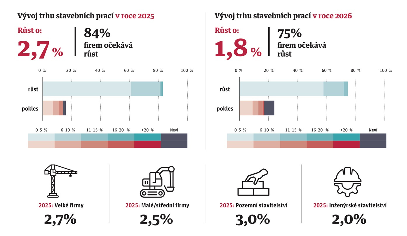 Průzkum: Stavebnictví letos poroste o 2,7 %, v roce 2026 o 1,8 %