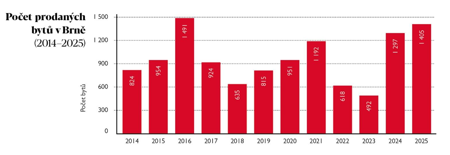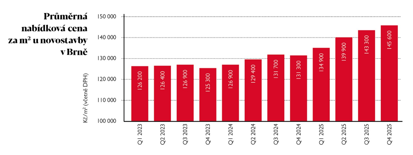 V Brně se loni prodalo 1405 nových bytů, což představuje nejvíce za posledních téměř 10 let. V roce 2024 se prodalo 1298 novostaveb. Zároveň výrazně vzrostly ceny – průměrná nabídková cena novostaveb ve 4. čtvrtletí 2025 překročila 145 tisíc korun za čtvereční metr, což představuje meziroční růst o 11 %.