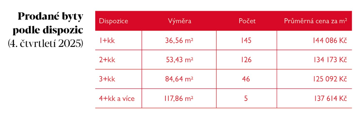 V posledním čtvrtletí 2025 se průměrná nabídková cena jednotky vyšplhala na 8,86 milionu korun. Táhnou především menší byty, které sice mají nižší celkovou výměru, zároveň však dosahují vyšší ceny za metr čtvereční než byty větších dispozic.