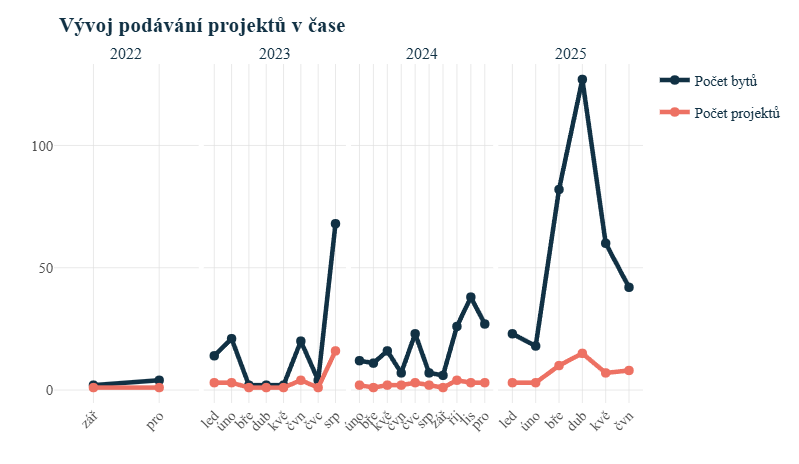 V jednotlivých letech počty podaných projektů v sociálním bydlení IROP kolísaly. K jejich významnému růstu došlo zejména na počátku roku 2025. Postupně se zvětšuje i velikost projektů. Za březen a duben 2025 IROP eviduje 25 nově podaných projektů s více než 200 sociálními byty. Nejvíce projektů podali žadatelé v Olomouckém a Jihomoravském kraji. Méně rozvinuté regiony jsou cílem největší podpory, ale zájem roste i mimo ně v tzv. přechodových regionech. Naopak o výzvy zaměřené na vyloučené lokality byl dosud menší zájem, MMR proto plánuje další kroky pro zvýšení jejich atraktivity.