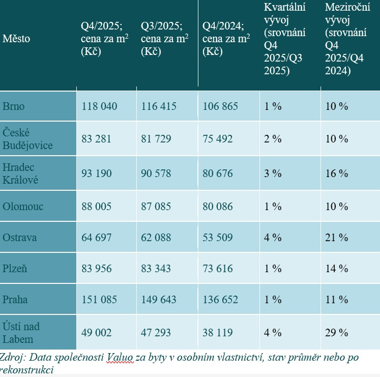 Ceny starších bytů v Česku v závěru roku 2025 dále rostly, a to jak v meziročním, tak v kvartálním srovnání. Ve zkoumaných 8 městech byty meziročně zdražily od 10 % v Brně či Olomouci do 29 % v Ústí nad Labem. V Praze zdražily o 11 %. Mezi čtvrtletími se ceny zvedaly v jednotkách procent. Vyplývá to z analýzy FérMakléři.cz na základě dat společnosti Valuo.