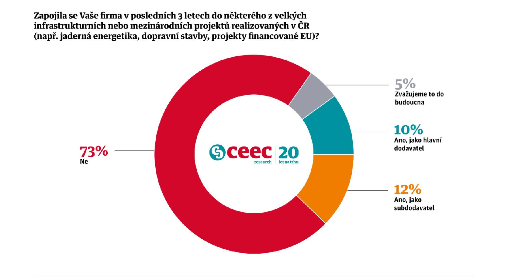 České stavební firmy se do mezinárodních projektů zapojují jen výjimečně, důvodem jsou především požadavky na reference nebo vysoká vytíženost kapacit či malá podpora státu. Za poslední 3 roky se takových projektů účastnilo jen 10 % domácích firem v pozici hlavního dodavatele, dalších 12 % jako subdodavatelé. Vyplývá to z nejnovějšího průzkumu CEEC Research, do kterého se zapojilo 165 stavebních firem.