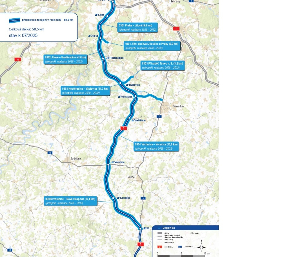 Středočeská část dálnice D3 zahrnuje několik úseků, které jsou připravovány zároveň: