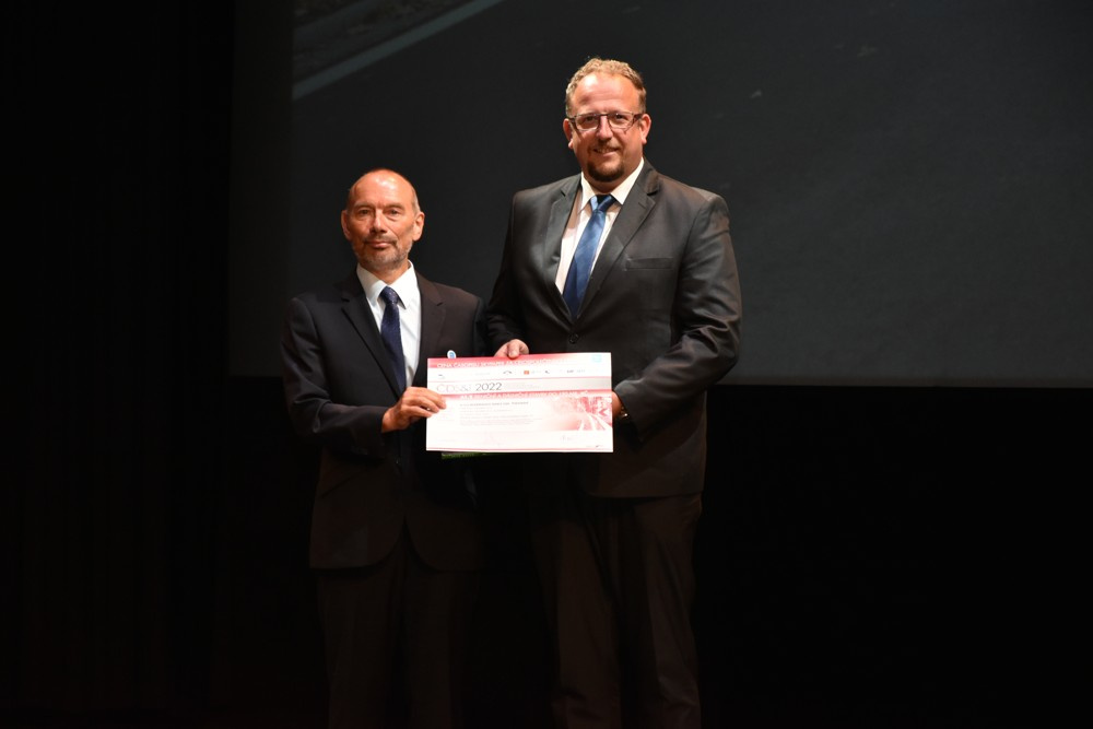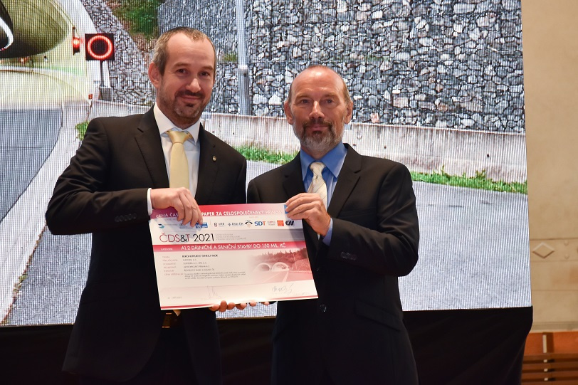 Cenu magazínu Skypaper v soutěži "Česká dopravní stavba, technologie, inovace 2014" přebírá od šéfredaktora Petra Bayera (vpravo) Jiří Sedláček ze společnosti SaM silnice a mosty Litomyšl.