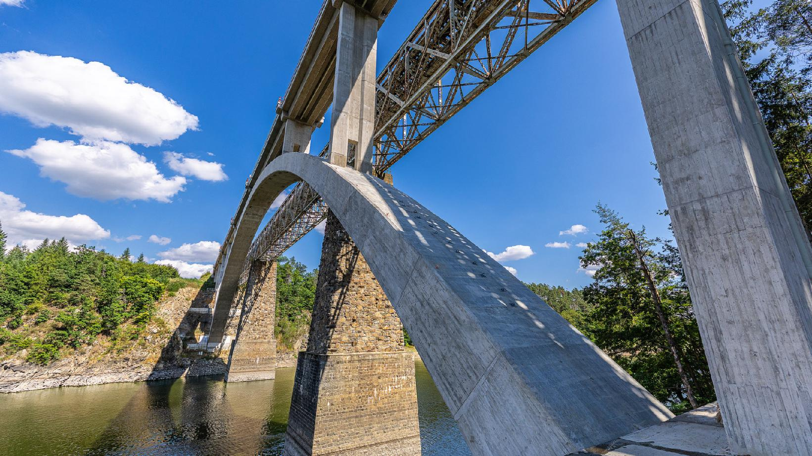 K technickým unikátům se nesporně zařadí železniční most v Červené nad Vltavou. Souběžně s historickým tělesem nýtovaného mostu z roku 1889, který se stal v průběhu výstavby kulturní technickou památkou, vznikl v mimořádně obtížných podmínkách nový železniční most. Výjimečný je už rozpětím betonového oblouku, které činí 156 metrů – nejvíce v Česku. Náročnost přípravy i realizace dokládá i technologie výstavby obloukového mostu, u které byla použita metoda letmé betonáže s posuvným bedněním a vyvěšováním přes provizorní pylony. Stavbaři museli průběžně vyhodnocovat aktuální deformace konstrukce pomocí numerických analýz.