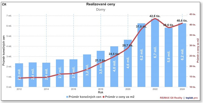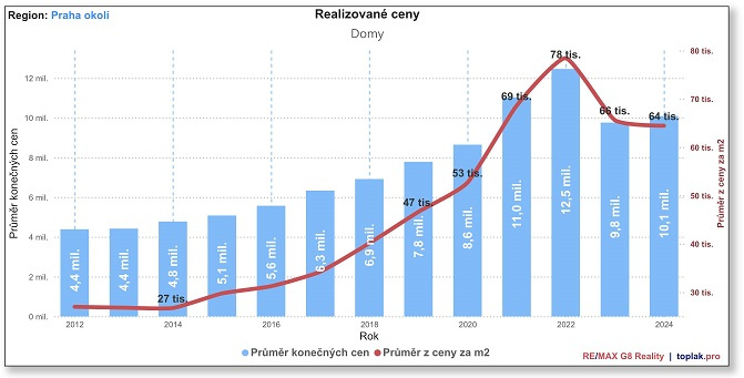 V roce 2012 byla průměrná cena za m2 plochy rodinného domu 15 tisíc Kč, což odpovídalo průměrné ceně 2,3 milionu Kč za dům. Po 10 letech se v roce 2022 se průměrná cena zvýšila na 42,8 tisíc Kč za m2, tedy 6,7 milionu Kč za dům. V roce 2023, v době vysokých hypotečních úroků ceny klesly na 38,6 tisíc Kč za m2 nebo 5,8 milionu Kč za dům. Letos ceny opět mírně rostou, v 1. pololetí činila průměrná cena 40,6 tisíc Kč za m2 nebo 6,2 milionu Kč za dům.