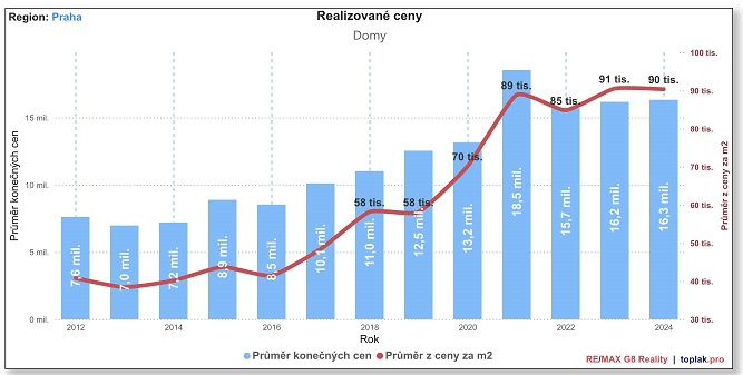 „V Praze dosáhly ceny rodinných domů vrcholu již v roce 2021, kdy průměrná cena za m2 činila 89 tisíc Kč a průměrná cena domu 18,5 milionu Kč. V roce 2022 ceny klesly na 85 tisíc Kč za m2 a 15,7 milionu Kč za dům. V roce 2023 došlo k malému růstu. V roce 2024, v 1. pololetí činila průměrná cena 90 tisíc Kč za m2 nebo 16,3 milionu Kč za dům,“ doplňuje Toplak..