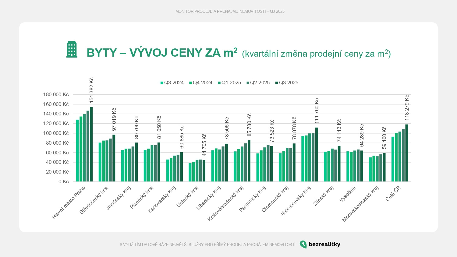 Nabídkové ceny starších pražských bytů se v 3. čtvrtletí zvýšily opět o 5 % na 154 382 Kč/m2. S růstem cen začínají byty k prodeji nabízet i majitelé, kteří je v posledních letech pronajímali. S pražským trhem se opět svázal středočeský, kam proudí poptávka domácností, které jdou za nižšími cenami. Průměrné nabídkové ceny na to reagovaly skokovým růstem na 97 019 Kč za m2 a jsou o 20 % výše než před rokem. Skokově vzrostly ceny také v Brně a smazaly tak stagnaci minulého kvartálu. Nyní se průměrný byt nabízí za 111 760 Kč za m2.