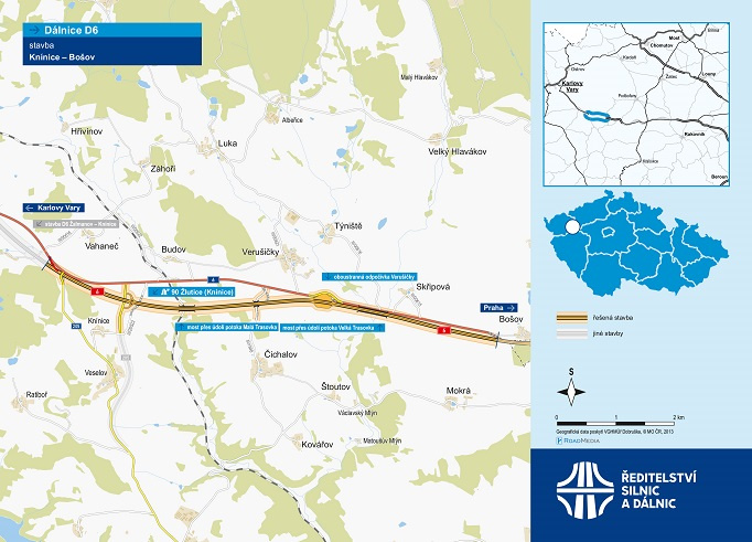 Ředitelství silnic a dálnic (ŘSD) začalo stavět další část dálnice D6, a to 7,9 kilometru dlouhý úsek Knínice – Bošov v Karlovarském kraji. Cena stavby, jejíž součástí bude i odpočívka, je 2,34 miliardy Kč bez DPH. Jde o další fázi přestavby silnice I/6 na dálnici. Řidiči by po této části D6 měli začít jezdit koncem roku 2027. ŘSD chce letos také začít stavět úsek D6 Žalmanov – Knínice.