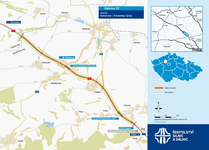 Ředitelství silnic a dálnic (ŘSD) začalo stavět úsek dálnice D7 z Kutrovic do Panenského Týnce ve Středočeském kraji. Práce na 6,8 kilometru dlouhé stavbě vyjdou na 1,3 miliardy Kč bez DPH, potrvají dva a půl roku. Hlavním cílem je přestavět části silnice I/7 na dálnici se čtyřmi pruhy. Příští týden začne ŘSD stavět i poslední chybějící středočeský úsek D7 mezi Knovízí a Slaným.