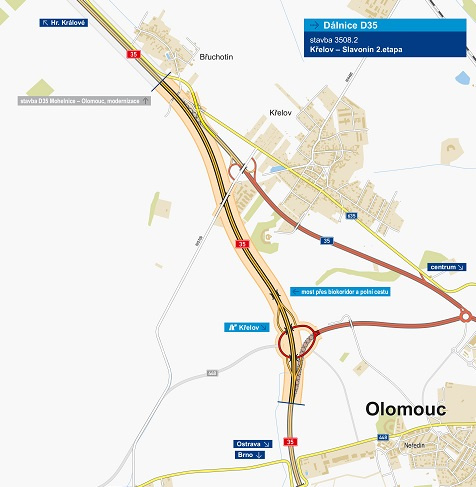 Silničáři zahájili stavbu 2. etapy dálnice D35 v úseku Křelov – Slavonín, která dokončí západní obchvat Olomouce. Zároveň vznikne nepřerušený tah D35 mezi Mohelnicí a Lipníkem nad Bečvou. Komunikace o délce 3,2 kilometru přijde na 838 milionů korun bez DPH a má být hotova za 26 měsíců.