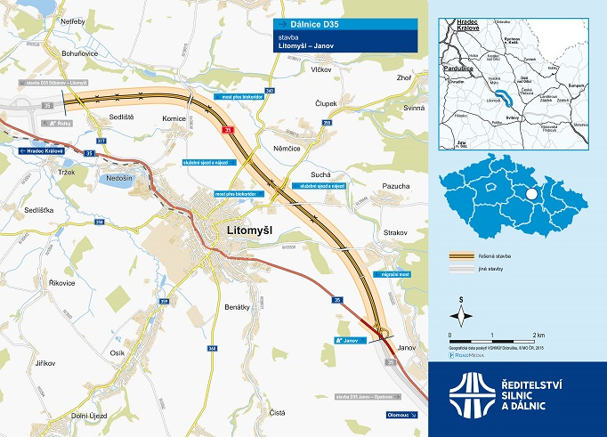 Ředitelství silnic a dálnic začalo stavět 10,4 kilometru dlouhý úsek dálnice D35 Litomyšl – Janov v Pardubickém kraji. Cena stavby dálničního obchvatu Litomyšle, která vzešla z výběrového řízení, je 2,8 miliardy Kč bez DPH, větší část nákladů uhradí EU. Řidiči by měli po obchvatu jezdit od léta 2027.