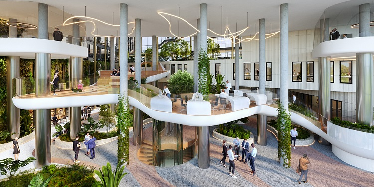 - Aktivace atria a společných prostor: Atrium se stane živým srdcem budovy s plovoucími platformami sloužícími jako zasedací místnosti, salónky, studovny, auditoria, lezecká stěna a cvičební prostory. Bude obsahovat dvě soukromé zavěšené zasedací místnosti s panoramatickým výhledem na řeku, sdílenou zasedací místnost a velkou zimní zahradu ve druhém patře.