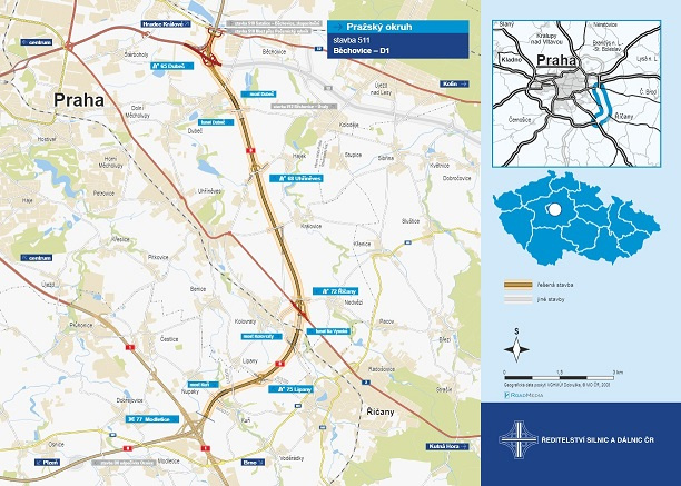 Dostavba Pražského okruhu v úseku D1 – Běchovice má být zahájena v 2. polovině letošního roku a uvedena do provozu v roce 2027. Předpokládaná hodnota veřejné zakázky činí 15,07 miliardy Kč bez DPH. „V současné době probíhá veřejné výběrové řízení na zhotovitele dostavby 12,6 kilometru dlouhé jihozápadní části Pražského okruhu mezi dálnicí D1 a Běchovicemi. Jako základní termín pro podání nabídek bylo stanoveno datum 22. února 2024,“ uvádí Ředitelství silnic a dálnic.