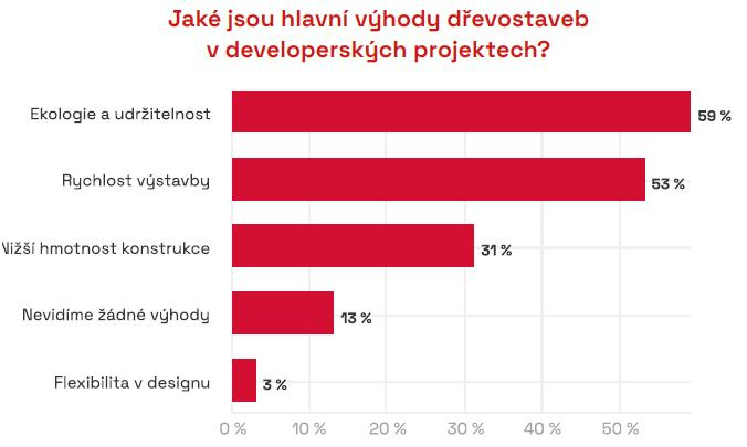 Podle průzkumu 52 % ředitelů developerských společností předpokládá růst počtu dřevostaveb, zatímco 48 % si myslí, že situace zůstane beze změny. Tři pětiny developerů vnímají jako největší výhodu dřevostaveb ekologii a udržitelnost, což značí rostoucí zájem o šetrné stavební technologie. Další klíčovou výhodou je rychlost výstavby, kterou zmiňuje 53 % developerů. 31 % dotázaných vnímá jako významný přínos také nižší hmotnost konstrukce, což dává stavbám větší flexibilitu při použití na různých typech terénů.