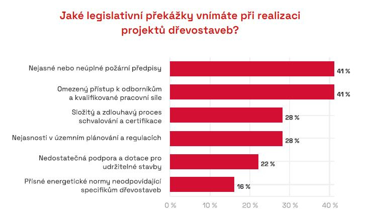 Legislativa kolem dřevostaveb je totiž v ČR stále složitá a plná překážek. Například Rakousko dlouhodobě podporuje dřevostavby a jejich legislativa nabízí jasné požární a energetické normy, které umožňují jejich širší uplatnění. Česká pravidla jsou nejednoznačná, což jako problém uvedlo 41 % respondentů. České předpisy jsou zvlášť komplikované u větších projektů, kde jsou požadavky přísnější a zpomalují nebo zcela blokují schvalovací proces. To uvádí jako problém 28 % developerů, přičemž nejasnosti v územním plánování a regulacích také vytvářejí překážky pro 28 % respondentů. Problémem je i omezený přístup k odborníkům a kvalifikované pracovní síle (41 %).