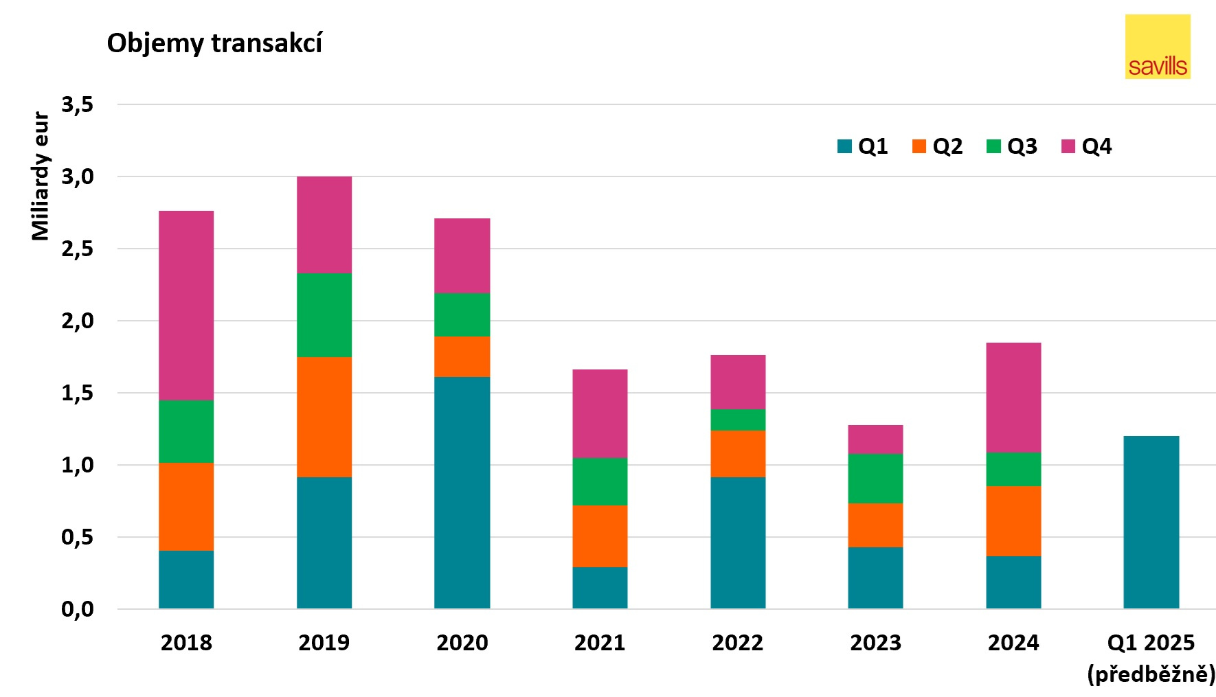 V Česku byly během 1. čtvrtletí 2025 již uskutečněny investiční transakce s komerčními nemovitostmi v hodnotě za více než 1 miliardu eur (přibližně 25 miliard korun). To představuje 180% růst ve srovnání se stejným obdobím loni. Zároveň jde o nejsilnější čtvrtletí od roku 2020. V evropském kontextu se očekává celkový objem investic za 1. kvartál letošního roku kolem 50 miliard eur, což by odpovídalo meziročnímu růstu o 28 %. Registruje se rozsáhlé oživení trhu, přičemž meziroční zvýšení investiční aktivity je patrné ve většině zemí. Nejvýraznější posun se oproti 1. čtvrtletí loni očekává v ČR, Portugalsku, Francii, Irsku a Rumunsku.