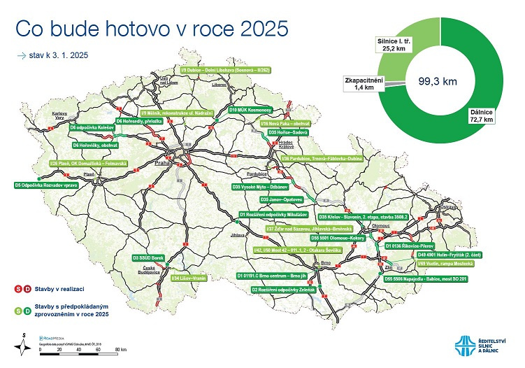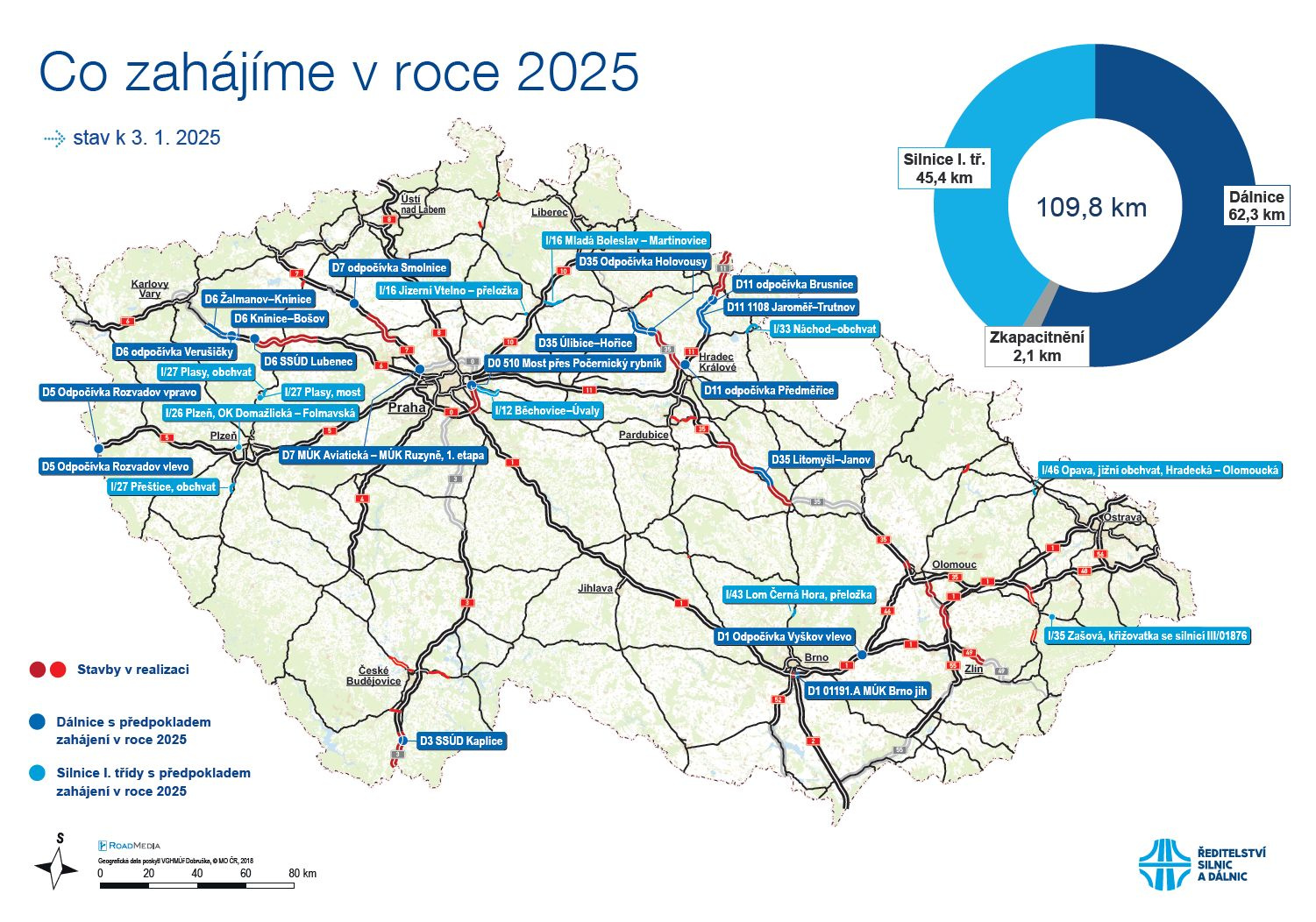 D1 u Přerova bude hotová dříve. V 1. čtvrtletí 2025 plánuje ŘSD uzavřít se zhotovitelem dodatek ke smlouvě, což umožní zkrátit realizaci úseku Říkovice – Přerov dlouhý přes 10 kilometrů z března 2026 na konec roku 2025. Na jaře bude hotové i rozšíření dálnice D1 ze 4 na 6 pruhů na obchvatu Brno centrum – Brno jih. „Pokračujeme v dostavbě základní dálniční sítě, která by měla být hotová v roce 2033. V nejbližší době začne stavba obchvatu Litomyšle, což je poslední nerozestavěný úsek dálnice D35 v úseku Litomyšl – Janov. Významný úsek na dálnici D11 mezi Jaroměří a Trutnovem by měl být zahájen v 3 nebo 4. čtvrtletí 2025, což znamená, že dálnice D11 bude rozestavěná v celé délce,“ uvedl generální ředitel ŘSD Radek Mátl.