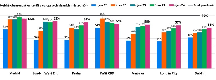 Praha prolomila poprvé od pandemie hranici 60 % fyzické obsazenosti kanceláří, když v říjnu letošního roku dosáhla 61 %. Ve srovnání s rokem 2022 se využití kanceláří zvýšilo dokonce o 23 procentních bodů. I s tímto nárůstem se však Praha umisťuje na 3. místě v Evropě, za prvním Madridem (66 %) a londýnskou oblastí West End (63 %). Nejvytíženějším dnem v pražských kancelářích je středa, kdy je obsazenost 66 %. Zatímco v pátek nechodí do práce v evropských městech ani polovina zaměstnanců, v Praze naopak sledujeme nárůst na 53 %. Uvádí to průzkum Savills European Office Occupancy Rates.