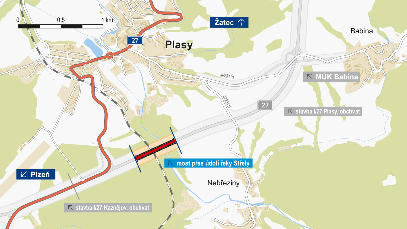 „Silnice I/27 z Plzně na Žatec a Most, která prochází celými Plasy a vede kolem kláštera a nepřehlednými zatáčkami s táhlým stoupáním či klesáním, je dopravně významně zatížená. Denně tam projede až 10 000 aut a stále přibývá nákladních vozidel. Obchvat dlouhý 5,6 kilometru, jehož součástí bude most přes řeku Střelu, vyvede dopravu z centra Plas a řidiči se vyhnou zatáčkám, kde se stávají i vážné nehody. Součástí obchvatu bude mj. mimoúrovňová křižovatka Babina,“ dodává generální ředitel ŘSD Radek Mátl.