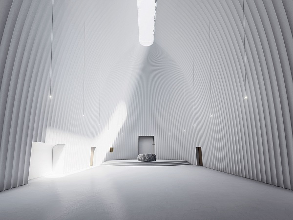 Vstup do objektu upoutá pozornost čtyřdílným oknem, které symbolizuje čtyři evangelisty. Architektura lodi kostela připomíná archu, zatímco věž evokuje postavu, která se k arše sklání. Místo, kde se kostelní věž dotýká obvodového pláště, je identické s držením dítěte madonou. Po obvodu svatyně ve spirále stoupá bezbariérová stezka, stejně jako se ve spirále mezi zemí a nebem vyvíjí lidský život. Tato stezka je lemována provozními místnostmi určenými k setkávání. „Celá stavba zosobňuje církevní společenství daného místa, ale svým tvarem také odkazuje na dynamiku dějin, které zmítají celým lidstvem,“ doplňuje Fránek.