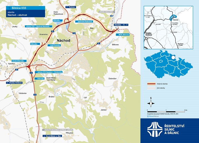 Ředitelství silnic a dálnic (ŘSD) začalo stavět 6,5 kilometru dlouhý obchvat Náchoda na silnici I/33 v Královéhradeckém kraji. Cena stavby, jejíž součástí budou i 2 tunely, je 3,18 miliardy Kč bez DPH. Související paralelní stavbou bude přeložka silnice I/14 Vysokov – Vrchoviny. Řidiči by po obchvatu měli začít jezdit v 1. čtvrtletí roku 2028.