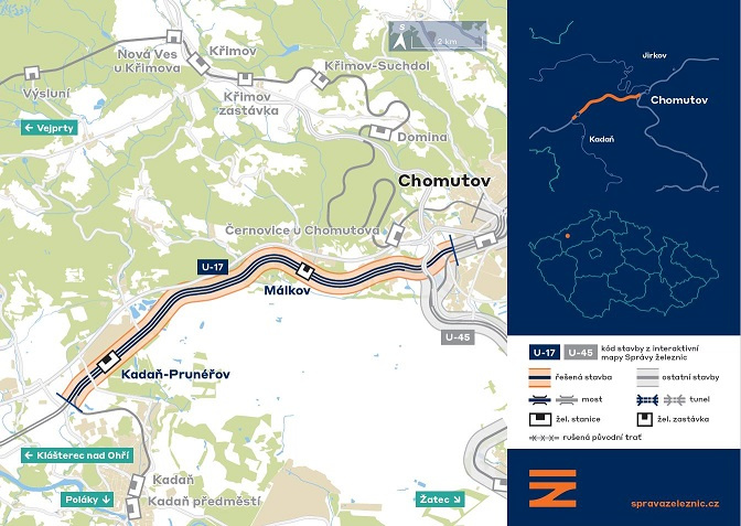 V polovině letošního roku zahájí Správa železnic rekonstrukci traťového úseku mezi Chomutovem a Kadaní. Nyní hledá zhotovitele prací, předpokládané celkové náklady stavby dosahují 3,75 miliardy korun. Zahájení prací se plánuje v červnu, dokončení v závěru příštího roku. Stavba přinese zvýšení traťové rychlosti až na 160 km/h, cestující na nádražích získají pohodlný přístup na nástupiště i nástup do vlaků.