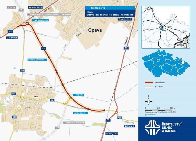 Ředitelství silnic a dálnic (ŘSD) začalo stavět další část jižního obchvatu Opavy, 2,3 kilometru dlouhý úsek Hradecká – Olomoucká. Cena stavby je 381 milionů Kč bez DPH. Cílem přeložky silnice I/46 je vyvést tranzitní dopravu z centra města. Řidiči by po této části obchvatu měli jezdit koncem roku 2026. ŘSD plánuje, že celý silniční okruh Opavy dokončí v roce 2029.