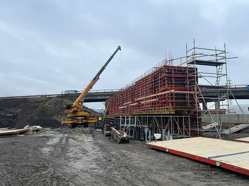 Desítky stavbařů nyní pracují na výztužích opěr mostu, na budoucí sjezdové větvi ve směru od Liberce do Kosmonos, na nové nájezdové větvi od Kosmonos na Prahu a také se buduje provizorní komunikace pro stavbu. Přeložky inženýrských sítí jsou už takřka hotovy, nadále dochází i ke skrývce ornice. V následujících týdnech je v plánu betonáž opěr mostu, nebo přeložka vedení velmi vysokého napětí, což si vyžádá omezení provozu na dálnici.