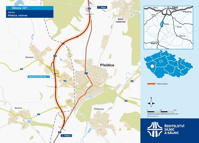 Ředitelství silnic a dálnic (ŘSD) začalo stavět 5,3 kilometru dlouhý obchvat Přeštic na silnici I/27 v Plzeňském kraji. Cena stavby, která vzešla z výběrového řízení, je 788,3 milionu Kč bez DPH, větší část nákladů je hrazená z evropských prostředků. Řidiči by měli po obchvatu jezdit od konce roku 2026.
