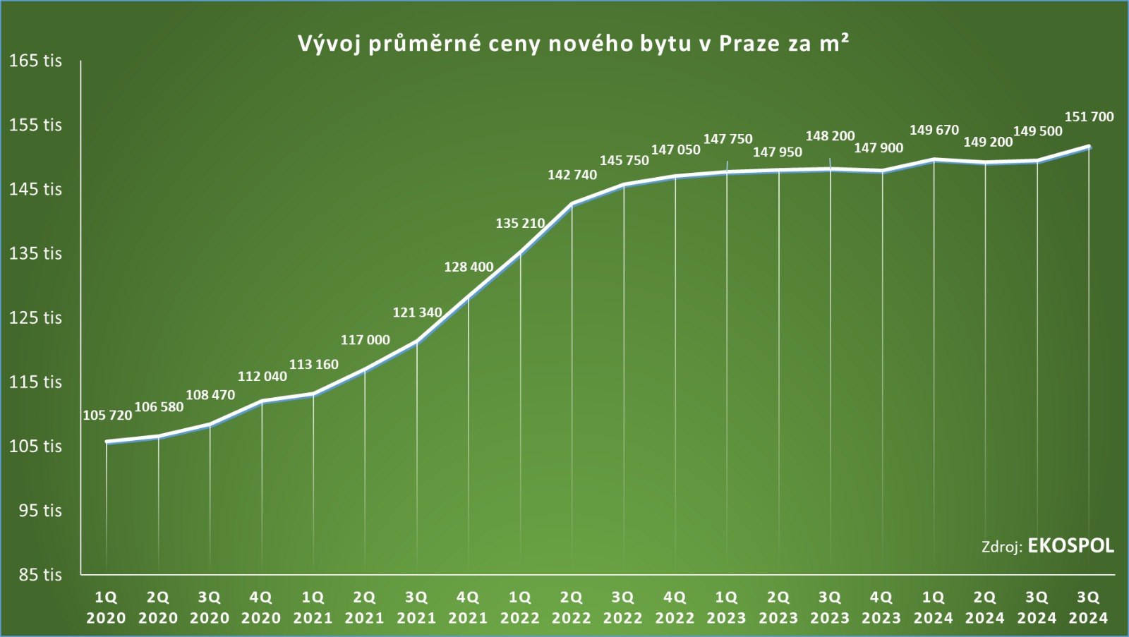Ceny nových bytů v nabídkách developerů neustále rostou. V cenících developerů jsou podle metodiky Ekospolu poprvé v historii měření vyšší než 150 tisíc Kč za m2. Tuto hranici překonala průměrná cena o 1700 korun, což je o zhruba 3 % více než o rok dříve. „Ceny nových bytů žene vzhůru zvýšená poptávka, která stále převyšuje nabídku. Tu limituje jeden z nejkomplikovanějších procesů povolování nových staveb na světě a nedostatek stavebních pozemků v hlavním městě kvůli vyčerpanému územnímu plánu. Dlouho očekávaná digitalizace stavebního řízení skončila katastrofou, takže změny k lepšímu se jen tak nedočkáme,“ prohlašuje Korec.