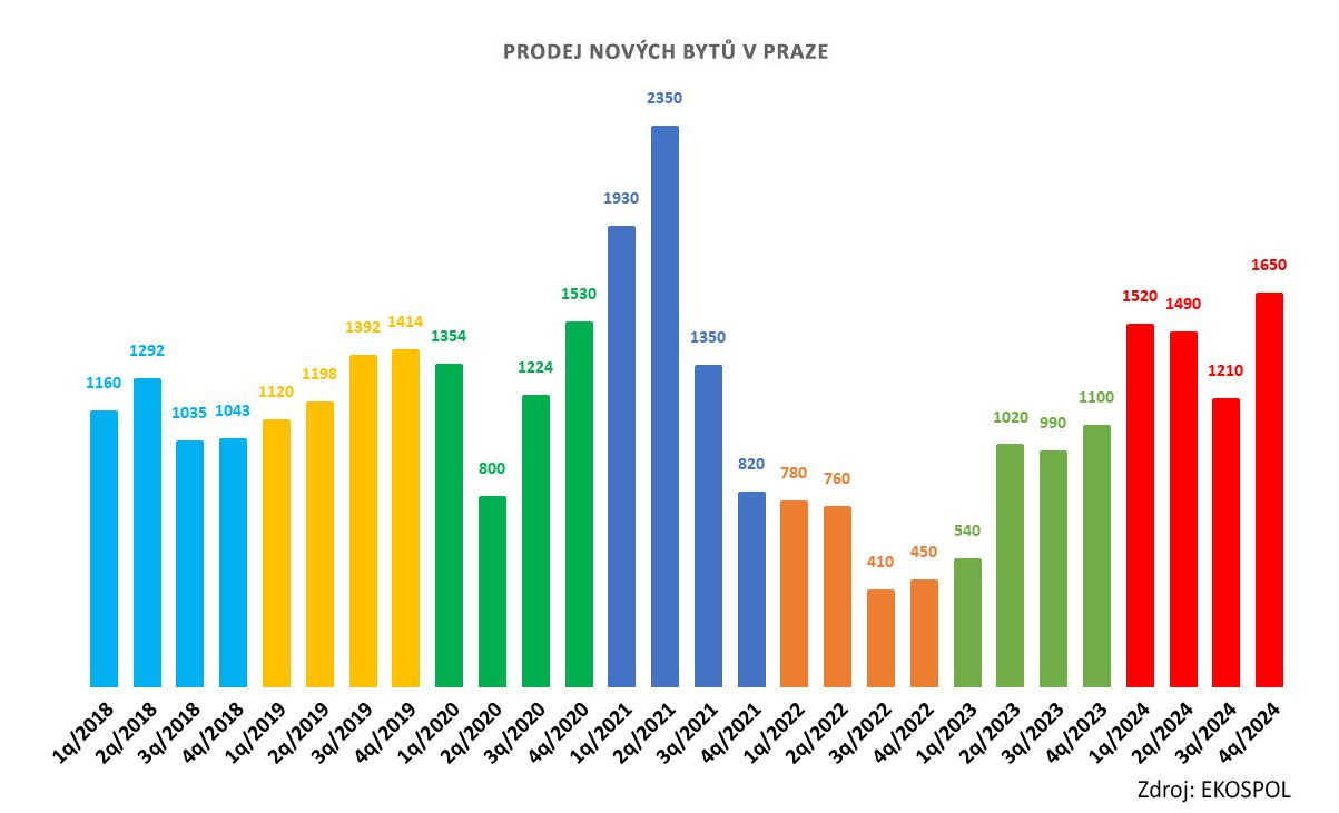 Developeři na pražském trhu loni prodali 5870 bytů, ve srovnání s rokem 2023 o 61 % více. Po rekordním roce 2021 jde o druhé nejvyšší prodeje za posledních 8 let. Jen za poslední čtvrtletí 2024 se prodalo 1650 nových bytů, což představuje meziroční růst o 50 %. Vyplývá to z analýz společnosti Ekospol.
