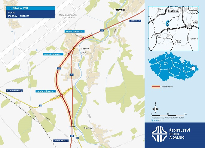 Ředitelství silnic a dálnic zprovoznilo stavbu 3,3 kilometru dlouhého obchvatu Mošnova na silnici I/58 v Moravskoslezském kraji. Práce za 368,4 milionu Kč bez DPH trvaly 20 měsíců. Obchvat odvede tranzitní dopravu ze zastavěné části obce a zajistí dobré dopravní napojení mezinárodního letiště Leoše Janáčka a průmyslové zóny Ostrava-Mošnov na dálniční síť. V Moravskoslezském kraji plánuje ŘSD řadu dalších obchvatů.
