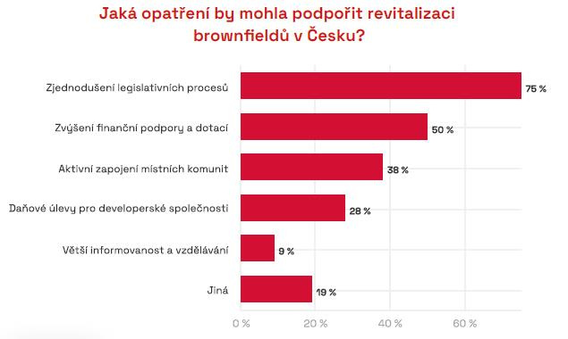 V řadě evropských zemí, například v Británii nebo Nizozemí, jsou brownfieldy revitalizovány díky cílené podpoře státu, zjednodušeným legislativním procesům a silnému zapojení místních komunit. V ČR podobná podpora zatím chybí a developery tak nejvíce brzdí složité legislativní procesy. Až 75 % ředitelů developerských společností by uvítalo zjednodušení legislativních procesů. Důležitým opatřením je zvýšení finanční podpory a dotací, které by pomohlo snížit náklady spojené s náročnou revitalizací. Zapojení komunit a získání podpory místních obyvatel by také výrazně pomohlo projekty urychlit.