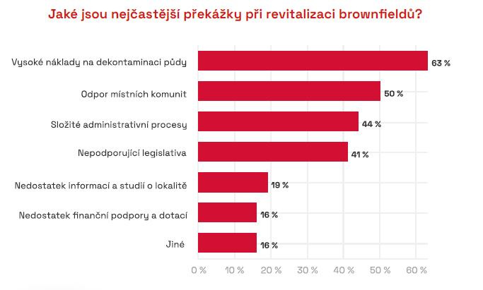 Mezi nejvýznamnější překážky, které komplikují nebo zpomalují revitalizaci brownfieldů, patří vysoké náklady na dekontaminaci půdy, odpor místních obyvatel a složité administrativní procesy. Dekontaminaci půdy uvedlo jako hlavní překážku 63 % respondentů. Původní průmyslové využití často zanechává půdu kontaminovanou chemikáliemi nebo nebezpečnými látkami, které musí developer před výstavbou odstranit. A to je velmi nákladné. Developeři uvádějí, že výstavba na brownfieldech je v průměru o 14 % dražší než výstavba na „zelené louce“. Kromě dekontaminace výstavbu prodražuje demolice stávajících objektů anebo technické komplikace, které bývají časté na těchto pozemcích. „Vzhledem k rozrůstání měst se tyto areály dostávají z periferie do městské zástavby. Jsou to již místně zajímavé pozemky, bohužel většinou zatížené ekologickými zátěžemi,“ uvedl člen představenstva VPÚ Deco Praha Lubor Hoďánek.