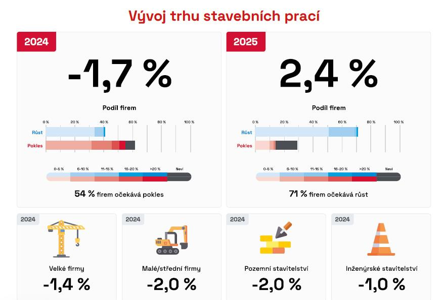 Průzkum: Stavebnictví má letos klesnout o 1,7 %, příští rok stoupnout o 2,4 %