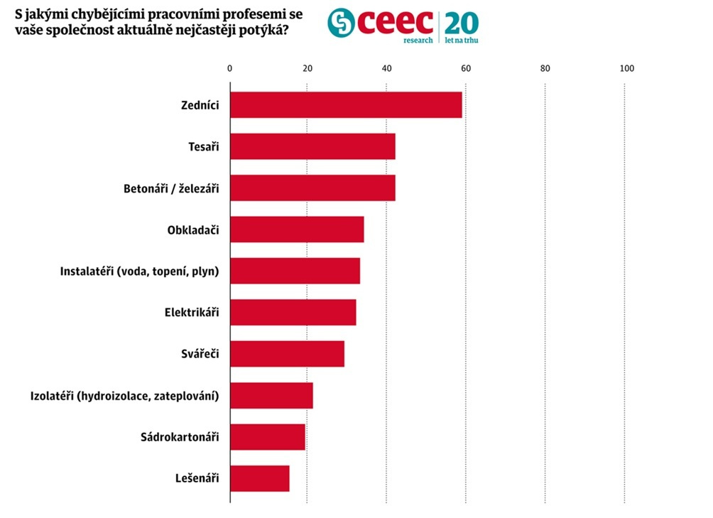 Českému stavebnictví dál kriticky schází lidi, s nedostatkem pracovníků potýká až 85 % stavebních firem. Nejvíce chybí zedníci (59 %) a tesaři (42 %), z odborných profesí rozpočtáři (56 %) a projektoví manažeři (38 %). Firmy na tuto situaci reagují především outsourcingem a spoluprací se subdodavateli. Vyplývá to z aktuálního průzkumu CEEC Research, do kterého se zapojilo 190 stavebních firem. „Nedostatek pracovní síly je dlouhodobý problém, který se v posledních letech ještě prohloubil. Firmám často nechybí zaměstnanci plošně, ale konkrétní odborné profese, bez kterých se projekt může výrazně zpozdit,“ líčí ředitel CEEC Research Michal Vacek.