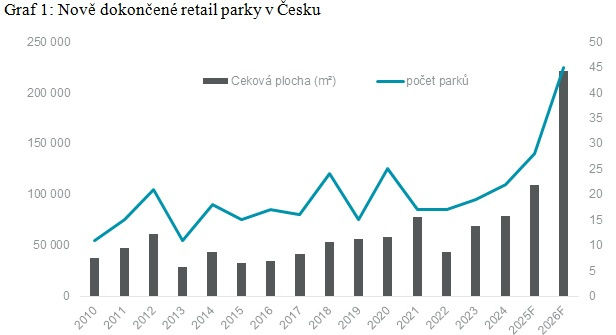 V roce 2024 bylo v Česku dokončeno téměř 80 000 čtverečních metrů nových, modernizovaných či rozšířených retail parků, což nyní tvoří 1,3 milionu m² maloobchodní plochy – téměř třetinu celkové kapacity maloobchodních ploch na trhu. Největší koncentrace těchto nákupních parků je ve Středočeském kraji, zatímco v přepočtu na 1000 obyvatel dominuje Olomoucký kraj. Dynamika růstu pokračuje – aktuálně se staví dalších více než 70 000 m² s plánovaným dokončením v roce 2025. Nejvíce se staví v Ústeckém a Středočeském kraji. V roce 2026 developeři plánují dodat na trh 45 retail parků s celkovou plochou přes 220 000 m².