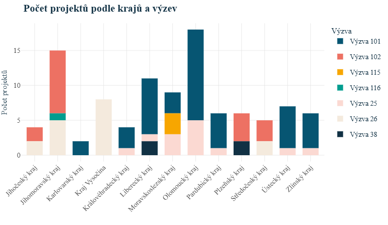 V Olomouckém kraji je nejvíce projektů, a to zejména díky zájmu o novou výzvu pro méně rozvinuté regiony (13 projektů). V 1. kole výzev bylo podpořeno 5 projektů. V Jihomoravském kraji byl zaznamenán největší zájem o novou výzvu pro přechodové regiony (9 projektů. V 1. kole bylo podpořeno 5 projektů. Výjimkou je Kraj Vysočina, kde byl naopak výrazně vyšší zájem o starší výzvu, ve které se podpořilo 8 projektů.