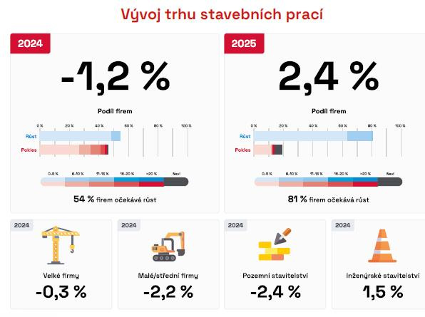 „Předpovědi firem naznačuji, že by se situace měla v roce 2025, kdy ředitelé stavebních firem počítají s celkovým oživením trhu, obrátit lepšímu. Růst stavební produkce však bude záležet, jakým způsobem se bude vyvíjet celková ekonomická situace a chuť investorů vypisovat zakázky. U dopravní infrastruktury jsou zprávy pozitivní, na rozdíl od pozemní výstavby, kde lze očekávat oživení trhu výrazně pomalejší“ říká ředitel CEEC Research Michal Vacek.