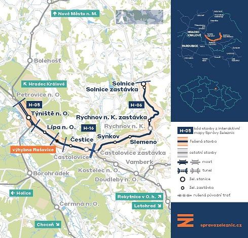 Správa železnic hledá zhotovitele prací na trati mezi Týništěm nad Orlicí, Častolovicemi a Solnicí. Výsledkem bude modernizovaná a kapacitnější trať, která umožní provoz většího počtu nákladních vlaků. To podpoří další rozvoj průmyslové zóny Solnice/Kvasiny. Rychlost vlaků se zvýší až na 120 km/h. Práce by měly začít v závěru letošního roku, hotovo bude na konci roku 2027. Celková předpokládaná hodnota prvních dvou etap je 2,5 miliardy korun.