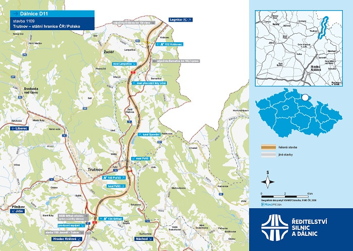 Ředitelství silnic a dálnic uzavřelo smlouvu se zhotovitelem dostavby 21 kilometrů dlouhého úseku dálnice D11 mezi Trutnovem a státní hranicí s Polskem za 11,7 miliardy korun bez DPH. „Začínáme s jedním z nejočekávanějších projektů, u kterého se podařilo překonat všechny překážky. Stavba dálnice D11 v úseku Trutnov – státní hranice s Polskem je historicky největší dálniční zakázka vybíraná ve veřejné soutěži v historii ŘSD. Hotovo bude nejpozději začátkem roku 2028, ale hraniční část v délce 3 kilometry už o 2 roky dříve,“ říká ministr dopravy Martin Kupka.