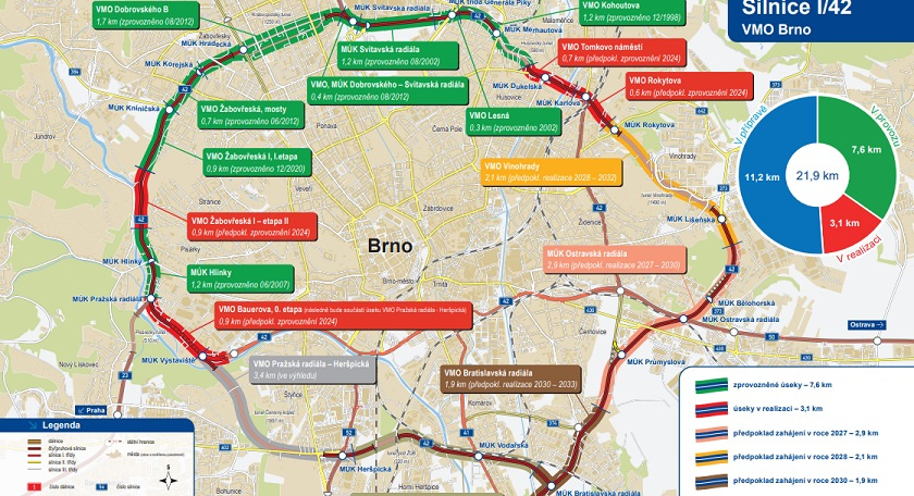 Druhá etapa stavby I/42 VMO Brno Žabovřeská byla zahájena v prosinci 2020. Stavba je součástí VMO, který bude po dokončení nejdůležitějším prvkem silniční části dopravního systému města. Okruh odstraní neúnosnou dopravní zátěž hlavních ulic a umožní rychlý přesun z jedné strany města na druhou.