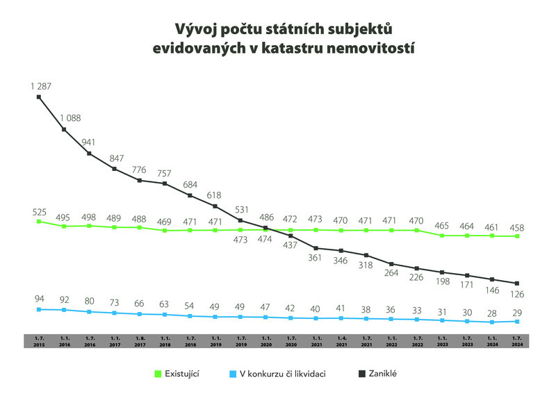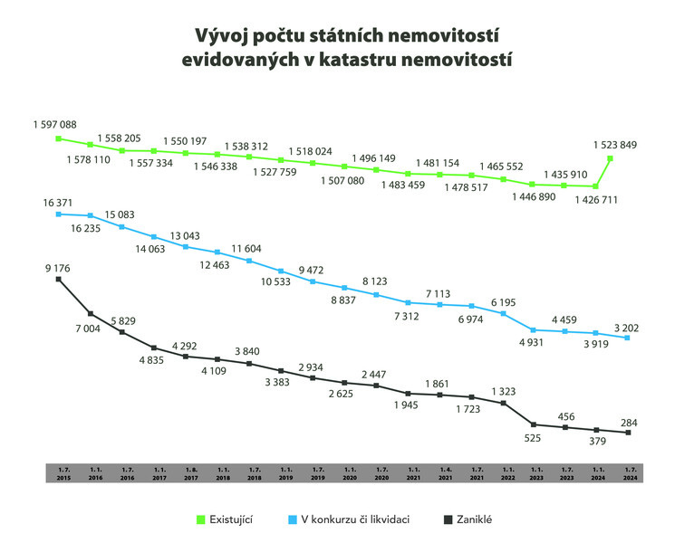 K 1. červenci 2024 bylo v katastru nemovitostí evidováno 613 existujících státních subjektů, které hospodaří se 1 523 849 státních nemovitostí. Tyto nemovitosti zahrnovaly 1 485 950 pozemků o celkové výměře přes 1,8 milionu hektarů, 40 598 staveb a 787 bytových a nebytových jednotek. Oproti konci loňského roku došlo k nárůstu o zhruba 100 tisíc nemovitostí, které státu po 1. lednu 2024 připadly po nedostatečně identifikovaných vlastnících.