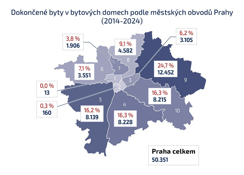 Největší rozvoj zaznamenala Praha 9, která se na celkovém počtu dokončených bytů za poslední dekádu podílela téměř ze čtvrtiny. Následují Praha 4, 5 a 10, každá s podílem přibližně 16 %. Tato čtveřice městských obvodů dohromady tvoří téměř tři čtvrtiny veškeré nové výstavby na území hlavního města. Důvodem je hlavně přítomnost velkých brownfieldů a rozvojových lokalit, které umožňují vznik zcela nových rezidenčních čtvrtí. „Aktuálně máme rozestavěno okolo 3 tisíc bytů v hodnotě zhruba 25 miliard korun. A dalších více než 35 tisíc bytů, které poskytnou bydlení pro zhruba 70 tisíc lidí, připravujeme,“ líčí Váňová