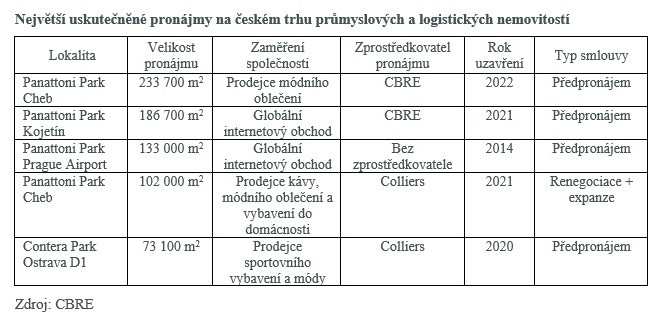 Z hlediska pronájmů “pod jednou střechou” jsou považovány za rekordní roky 2021 a 2022. Během té doby byly podepsány i dva největší pronájmy v tuzemské historii, a to 233 700 m2 v Chebu prodejcem módního oblečení a 186 700 m2 v Kojetíně Amazonem. Kromě toho překonal hranici 100 000 m2 i pronájem Tchibo v Chebu.