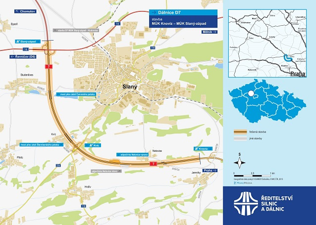 Ředitelství silnic a dálnic (ŘSD) začalo stavět úsek dálnice D7 z Knovíze do Slaného ve Středočeském kraji. Cena prací na 6,6 kilometru dlouhé stavbě je podle smlouvy 1,5 miliardy Kč bez DPH, potrvají 2,5 roku. Cílem je přestavět silnici I/7 na dálnici se čtyřmi pruhy. Nový úsek naváže na hotových 17 kilometrů D7 z Prahy do Slaného. ŘSD teď staví všechny tři chybějící úseky středočeské části D7.